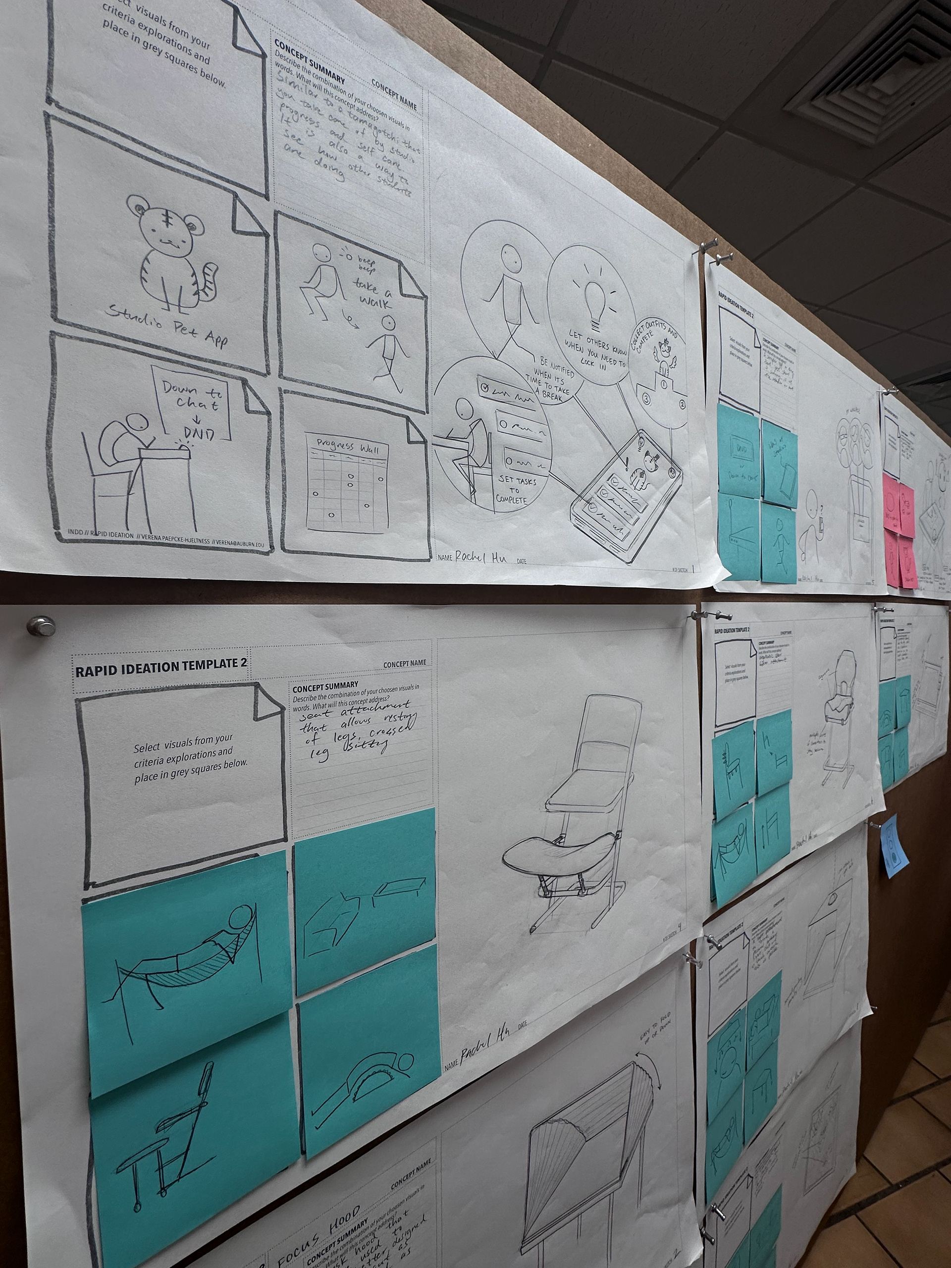 We began by exploring multiple sketches and discussing the pros and cons of each concept. Since our design was tailored to second-year students, we presented these ideas to them for feedback. Two rounds of feedback informed our iterations, helping us refine both form and function. While our initial research had considered comfort and studio bonding, we ultimately focused on achieving a better balance between focus, collaboration, and healthy work habits.